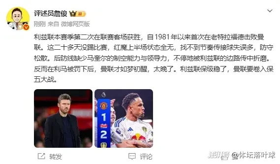 对曼联而言,这场失利是双重打击,此前他们在老特拉福德对阵利兹联英超10胜5平保持不败,如今金身告破;卡里克执教前六场主场全胜的完美开局,也在第七场主场战役中,与前辈奥法雷尔一样栽在利兹联脚下,宿命般的巧合,更让这场溃败多了几分宿命式的沉重。