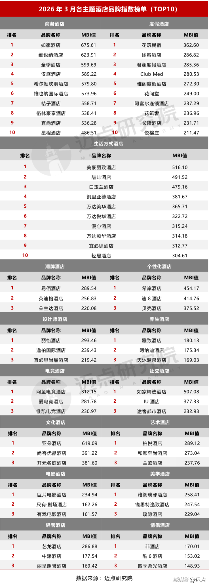 2026年3月酒店细分榜单分析: