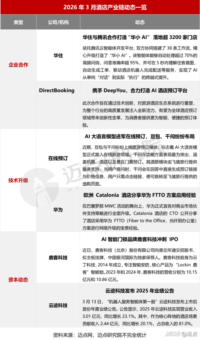 2026年3月,酒店产业链围绕AI技术落地、数字化升级、资本与企业动态持续推进。华住与腾讯合作打造的“华小AI”已落地超3200家门店,大幅提升酒店服务与运营效率;DirectBooking携手DeepYou共建 AI 酒店预订平台,推动预订场景智能化革新。同时,AI大语言模型加速入局在线预订,豆包、千问纷纷布局相关模块,华为也向海外酒店推广FTTO网络升级方案。资本层面,AI智能门锁品牌鹿客科技冲刺港股IPO,酒店服务机器人企业云迹科技发布2025年业绩,酒店场景收入占比超八成,产业链智能化、资本化趋势进一步凸显。