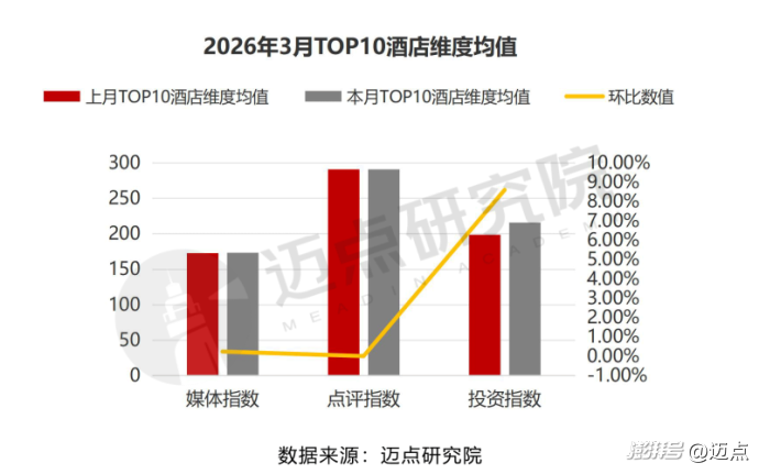 根据迈点研究院的最新数据,3月投资指数明显上涨,投资指数TOP10酒店的均值环比上涨8.6%。主要得益于商旅需求持续上升、供需格局改善及政策与资金支持。