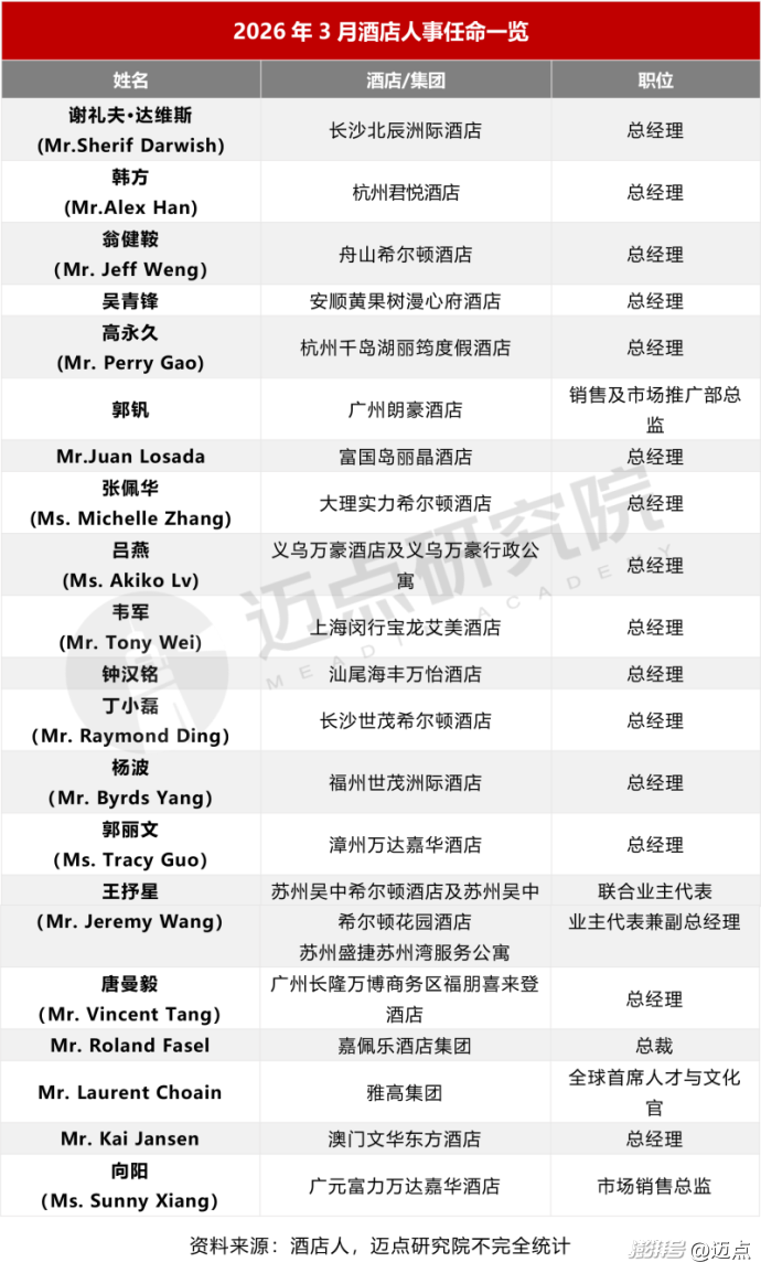据迈点研究院不完全统计,2026年3月共有20位酒店高管履新,其中涉及长沙北辰洲际酒店、杭州君悦酒店、舟山希尔顿酒店、安顺黄果树漫心府酒店、杭州千岛湖丽筠度假酒店、广州朗豪酒店、富国岛丽晶酒店等。