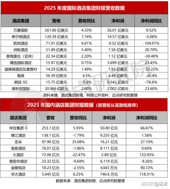 据迈点研究院统计,2025年国内外酒店集团业绩分化显著。国际酒店营收整体增长、盈利差异突出,凯悦、洲际、雅高营收增速领先,朗廷小幅下滑;洲际、精选国际净利大增,凯悦由盈转亏,朗廷、温德姆大幅下滑。国内市场华住、亚朵营收与净利双增,其余多数企业营收承压、盈利分化明显。