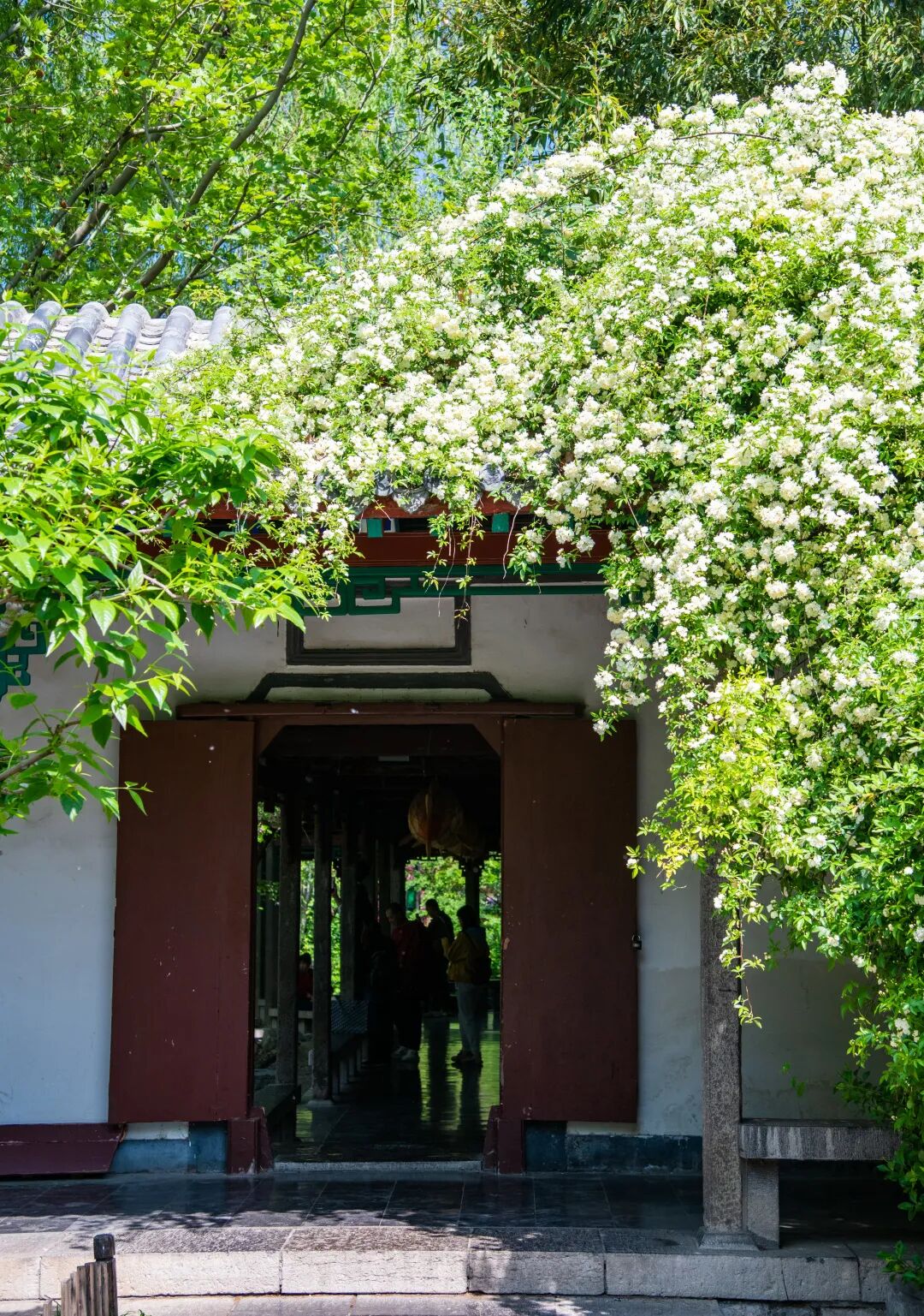 木香花更是惊艳,如瀑如雪倾泻而下,馥郁香气漫溢四周,沁人心脾。