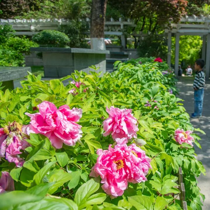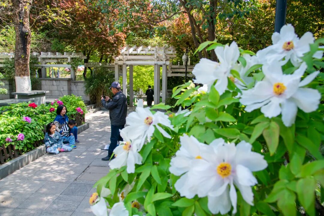 公园内的牡丹褪去青涩,层层花瓣雍容华贵,粉的如霞,白的如玉,衬着古亭黛瓦,尽显中式雅致。