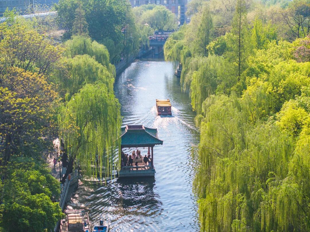 沿着护城河漫步,柳丝垂岸,游船悠悠,春风拂面,尽赏泉城春日的温婉与惬意。