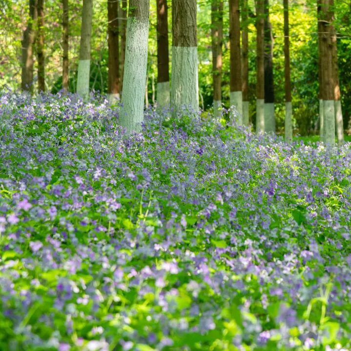 草坪上,二月兰铺成紫色花毯,星星点点的紫,温柔又治愈,与晚樱相映,藏着最灵动的春日野趣。
