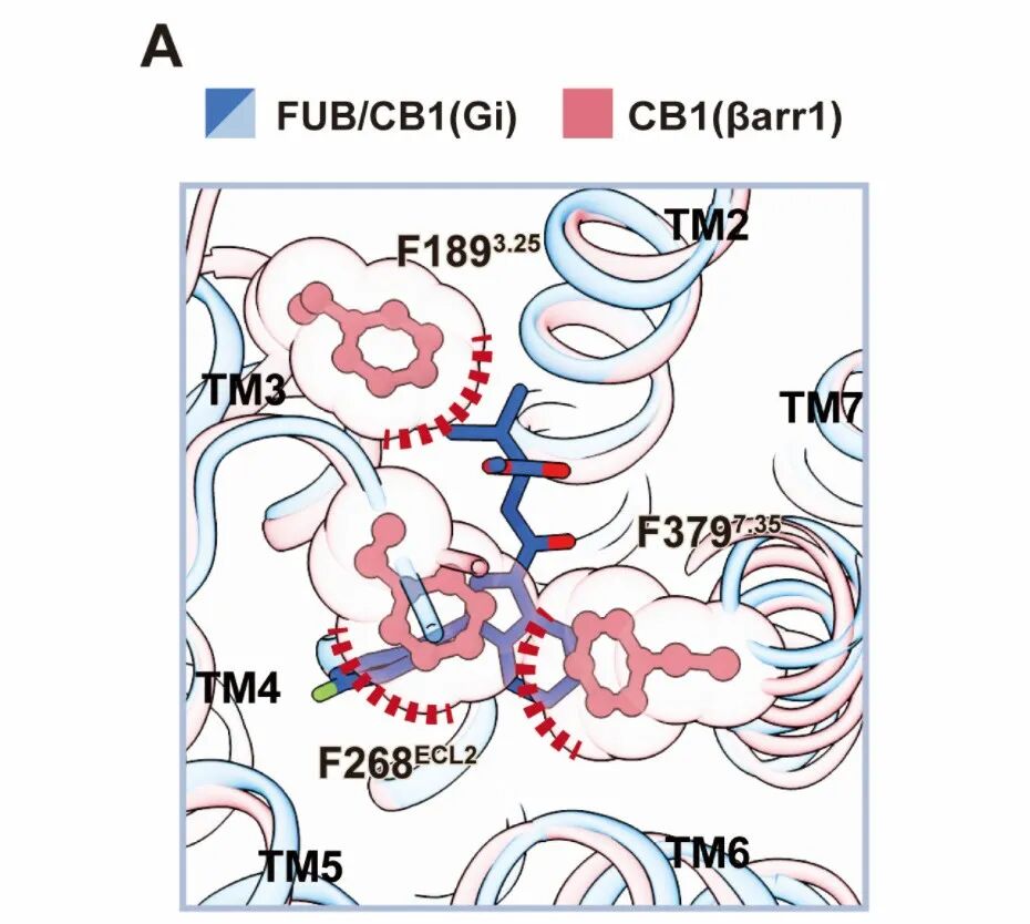 研究发现,当CB1与β-arrestin偶联时,受体结合口袋内三个芳香氨基酸残基与传统大麻类激动剂产生明显空间位阻,因而必须采取“深埋构象”,导致了副作用的发生。基于此,团队针对传统激动剂参与空间位阻的基团进行了理性设计:引入两种不同基团获得新型小分子,从而改变配体与受体结合模式,使其无法进入那个通往副作用的“深埋口袋”。