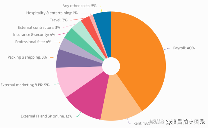 《报告》揭示了一组触目惊心的数据:在拍卖行业面临的最紧迫挑战中,运营成本与管理费用高居前两位,其占比较往年显著攀升。具体来看,人力成本占比高达40%;租金占比13%;外部IT及第三方平台成本占比12%;营销及公关占比9%;包装及运输占比5%。