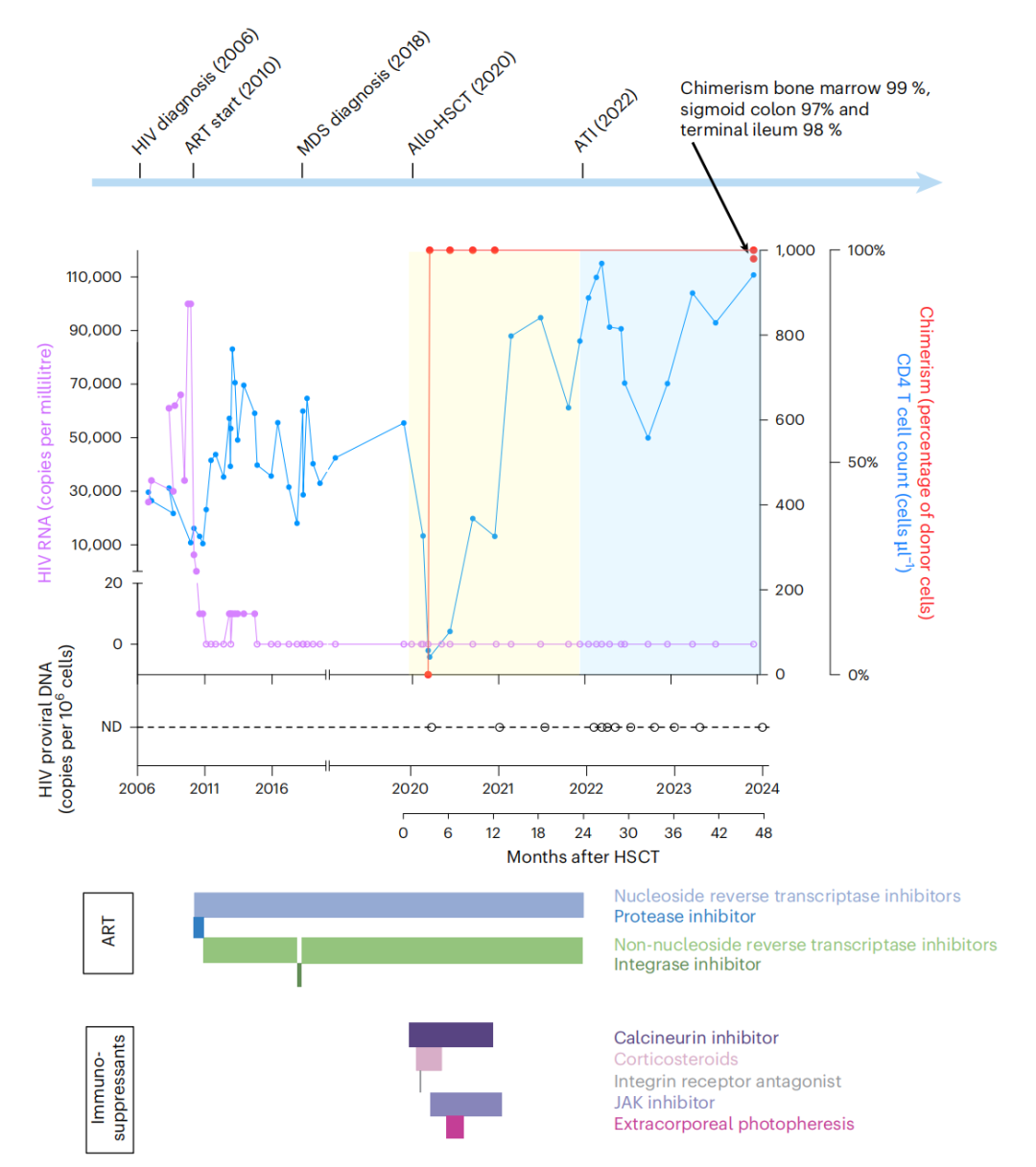 移植后,患者经历了严重的急性移植物抗宿主病(GvHD),但得到了有效控制。在移植 24 个月后,医疗团队经过审慎评估,决定为他启动“分析性治疗中断”,即停止所有抗 HIV 病毒药物。