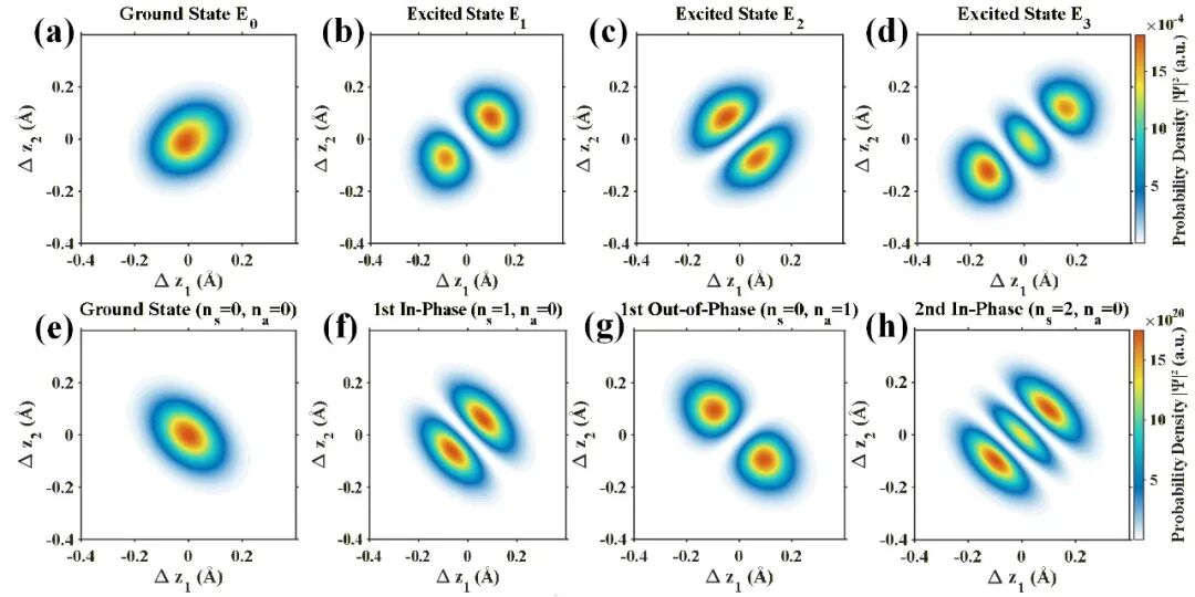 图3. (a-d) 双离子体系基态(E0)及前三个激发态(E1-E3)的概率密度分布。 (e-h) 理想二维耦合量子谐振子(CQHO)模型对应态的概率密度分布。这些态由其对称量子数(ns)和反对称量子数(na)标识。主对角线上的概率密度代表同相模式,反对角线上的概率密度代表反相模式。