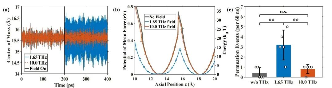 图2. 在无外场(黑色)、1.65 THz共振场(蓝色)和10.0 THz非共振场(红色)作用下,(a) 离子对质心的轴向轨迹对比。(b) 沿通道轴向的一维势能曲线(PMF)。(c) 在60 ns模拟时长内钙离子渗透事件统计。误差线表示95% bootstrap置信区间,显著性水平由泊松率精确检验确定。