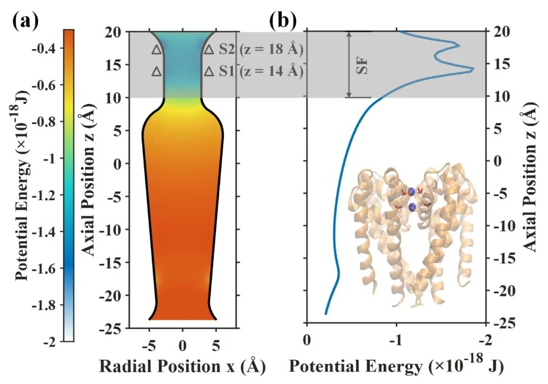 图1. 原核细胞钙通道纵截面的 (a) 二维和 (b) 一维电势分布图。图中灰色区域标注出了选择过滤器的范围,插图为该通道的晶体结构模型,z轴方向从胞内(-z)指向胞外(+z)。
