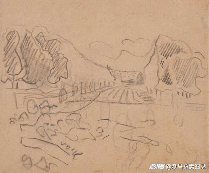 背面那幅风景速写,则以自由流淌的铅笔线条,勾勒出田野两侧的树列与地平线上沉重的孤云,只标注了“紫色”一个颜色,仿佛画家在疾驰的思绪中捕捉的瞬间灵光。