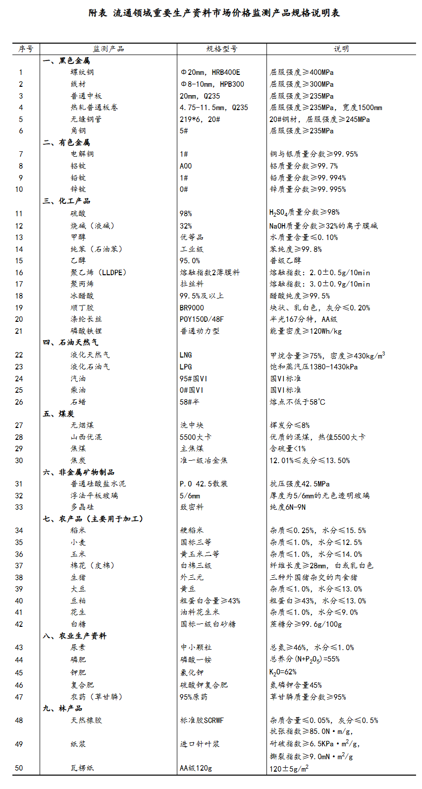 流通领域重要生产资料市场价格监测内容包括9大类50种产品的价格。类别与产品规格说明详见附表。