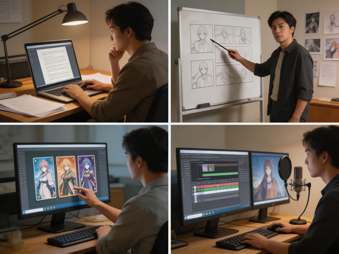 一般来说,先是编剧出剧本,把故事写出来, 然后导演拆解出分镜以及预生成一部分视觉资产(为了保证后续生成的一致性),抽卡师再根据导演分配的任务,通过提示词生成视频,等导演点头了,最后进行剪辑、配音等操作。