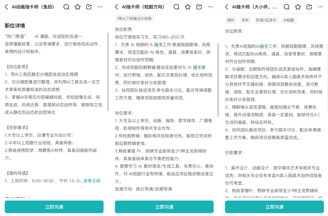 哪怕你没有数媒、美术、动画这些专业背景,只是爱看短剧、漫剧,或者对 AI 视频制作感兴趣,有些公司也能给你招进去,就是薪水给得低一点。