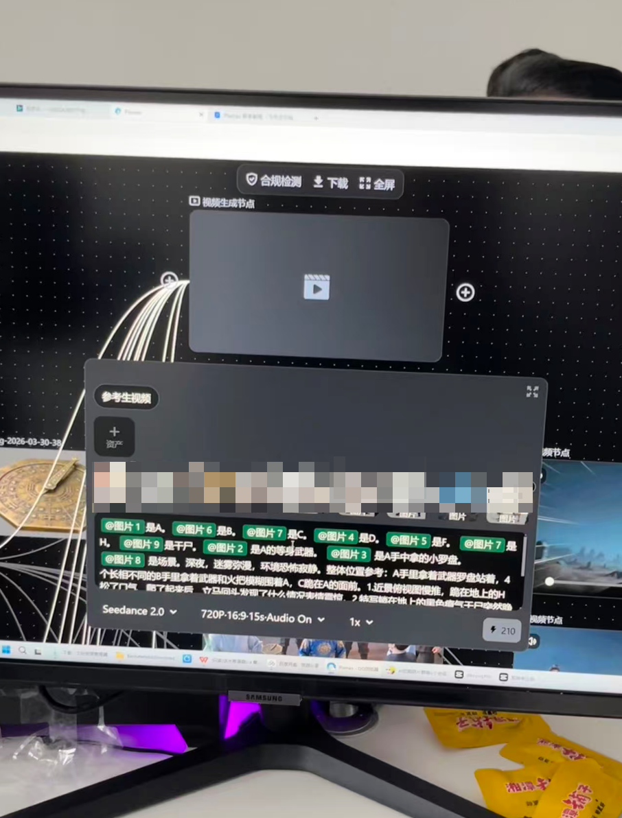现场的操作流程看起来并不复杂,抽卡师需要先上传提前生成的人物、场景、道具的参考图,然后尽可能精准地写好提示词,哪个分镜头是什么,几秒到几秒是什么画面。