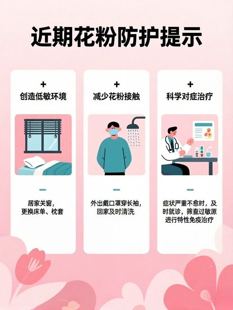 首先要及时关注,居家关窗。为自己做好防护,比如戴口罩和穿长袖衣物,积极保持健康的生活习惯等。如果已经有过敏症状请及时就医,遵医嘱进行药物治疗。