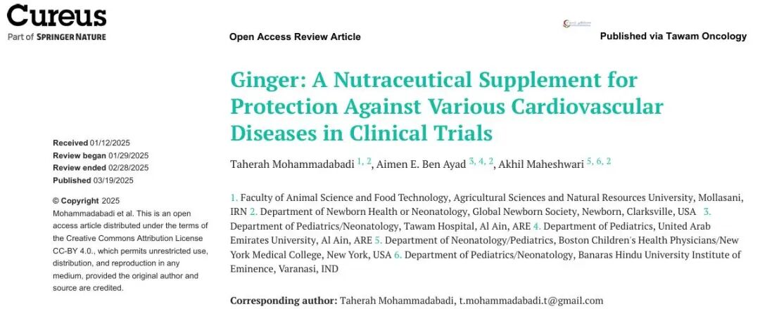 [1] Mohammadabadi T, Ben Ayad A E, Maheshwari A (March 19, 2025) Ginger: A Nutraceutical Supplement for Protection Against Various Cardiovascular Diseases in Clinical Trials. Cureus 17(3): e80841. doi:10.7759/cureus.80841