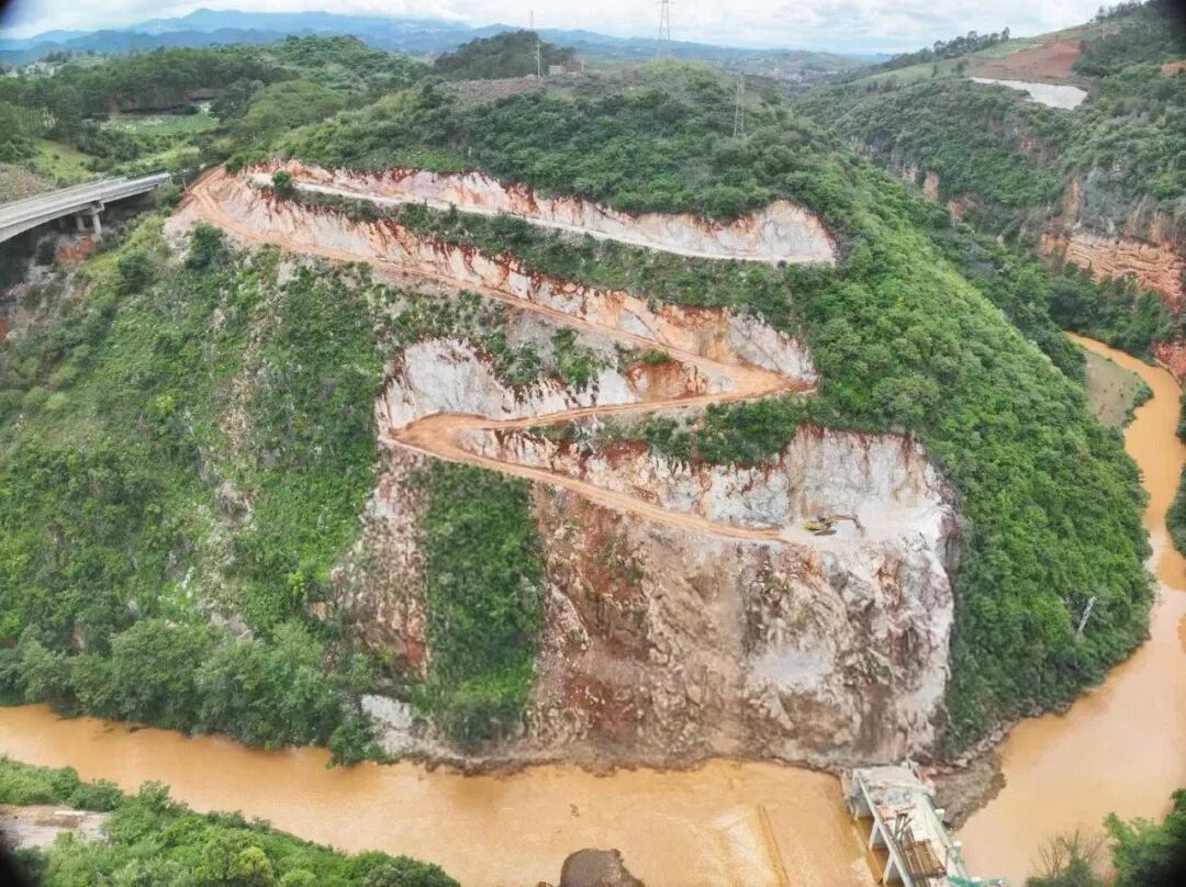 山区铁路建设,施工便道是先行命脉。文蒙铁路1标线路穿山过村、跨河越谷,地质破碎、地形陡峭,无现成道路、无平整场地、无稳定供电,施工便道修建堪称“在悬崖上造路”。盘龙河一号大桥地处V型峡谷,峭壁如削、植被茂密,紧邻蒙文砚高速公路大桥,无法大规模爆破,大桥人依靠机械在坚硬岩石上一点点开凿,耗时半年建成“之”字型临崖便道,保障了大桥桩基顺利施工。白沙坡跨蒙文砚高速匝道特大桥地势起伏大、临近村落农田,每推进一个墩位就要重新规划便道,大桥人在红线用地未批复时便超前策划,兼顾坡度、回转空间与征地协调,确保机械顺畅通行。