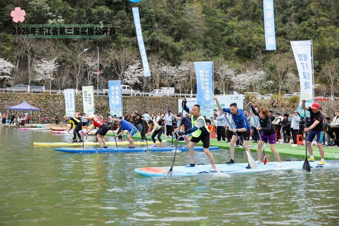 生态改善的成果,正悄然融入市民的日常生活。今年3月,浙江省第三届桨板公开赛在磐安县双溪乡西溪水域樱花公园景区内开赛,来自省内30支队伍的300多名桨板运动员劈波斩浪。参赛队员在清澈的溪水中尽情舒展身姿、展现技艺,与岸边盛放的樱花、翠绿的草木构成一幅动静相宜的春日美景。