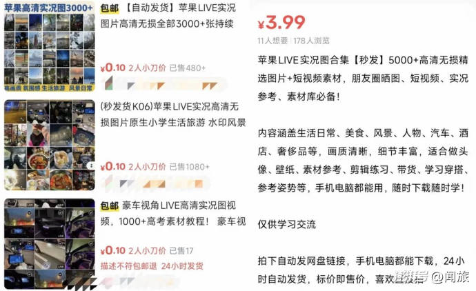 不过,量大管饱的静态图包已经有点过时了。因为静态图容易撞片,而且现在越来越多人在意朋友圈的“质感”。于是进阶玩法出现了,实况图和定制代拍。