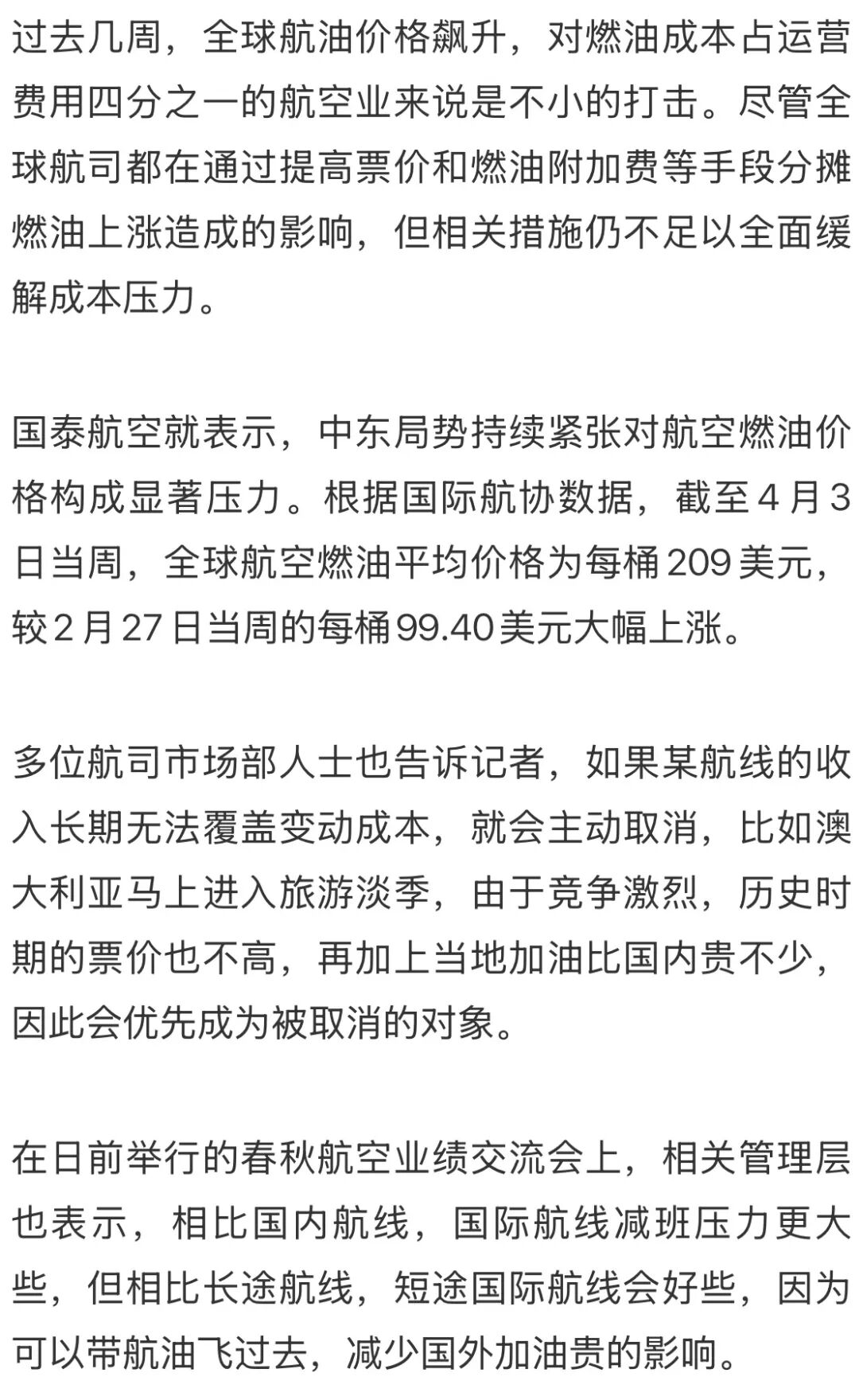 第一财经记者从多家航空公司获悉,从4月开始主动取消的航班确实有所增加,其中东南亚和大洋洲是重头,这与油价的大幅上涨不无关系。相比国内,部分国际机场加油价格更高,叠加需求和竞争的影响,部分航线的取消就首当其冲。