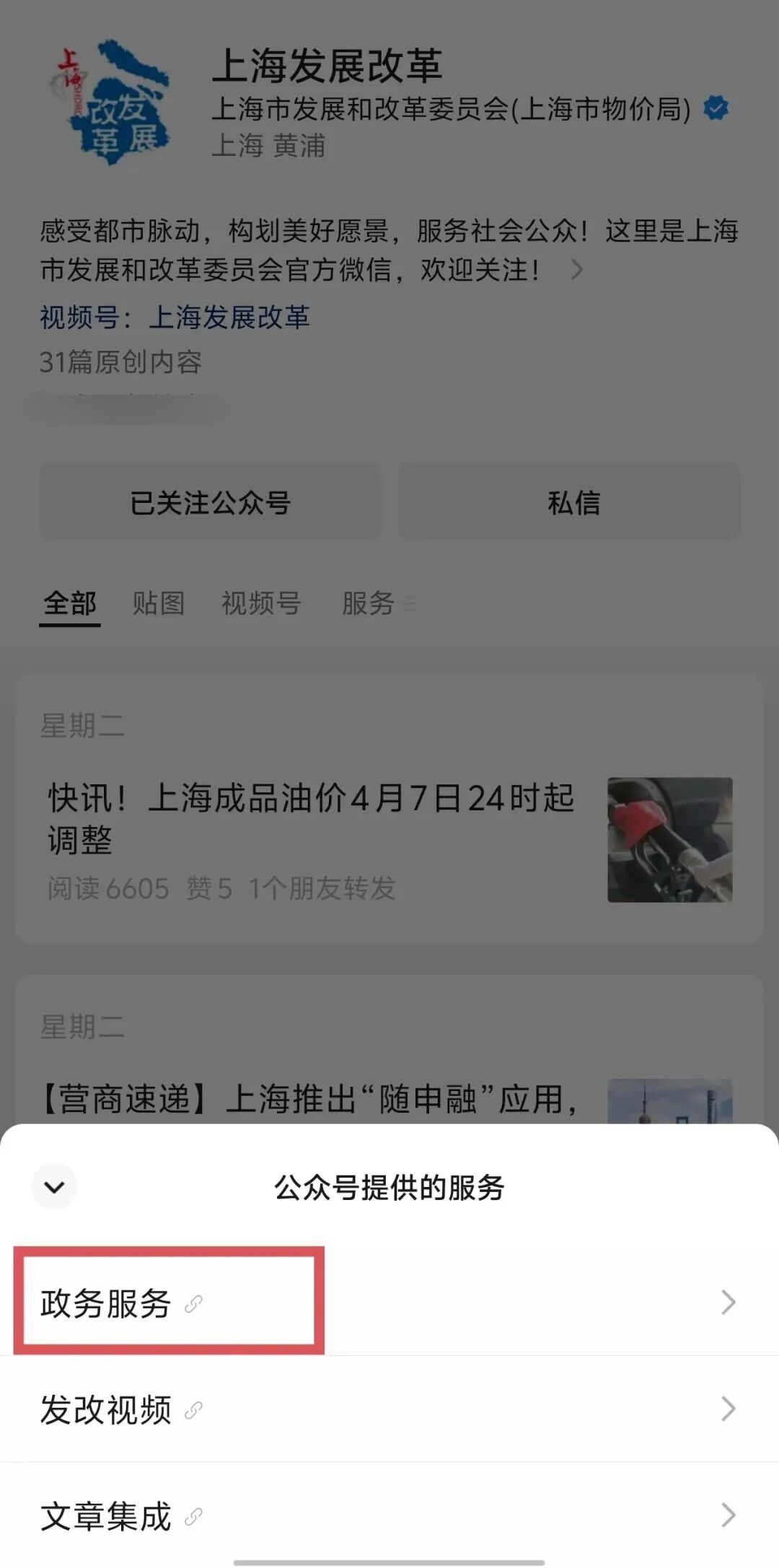 2、关注“上海发展改革”微信公众号,点击微信按钮“政务服务”,在“发改电子书”栏目查看相关内容。