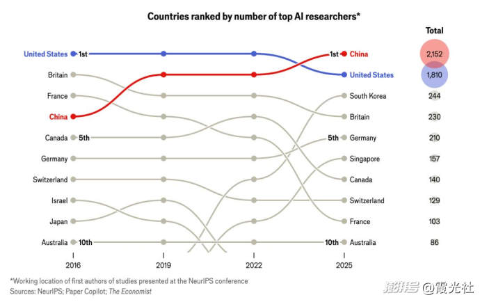 经济学人追踪了2025年12月举行的神经信息处理系统大会(NeurIPS)上发表论文的研究人员的教育背景,50%的AI研究人员在职业生涯初期来自中国(2019年仅为29%);与此同时,在美国起步的研究人员占比,则从20%下降到12%。它说明,全球AI顶尖研究人才的来源结构,正在重新洗牌。