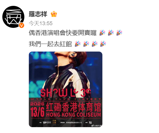 4月14日,罗志祥在个人社交媒体账号发布最新消息称,自己的香港演唱会快要开卖了,邀请大家一起前往红馆。