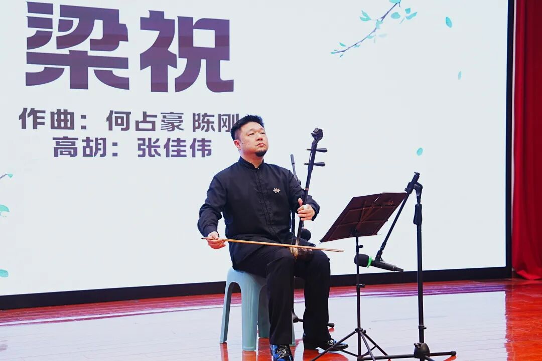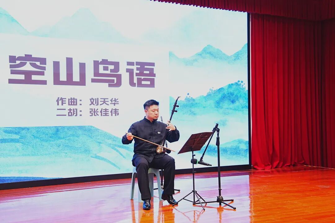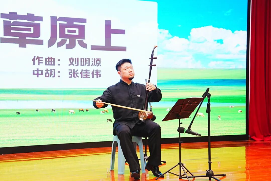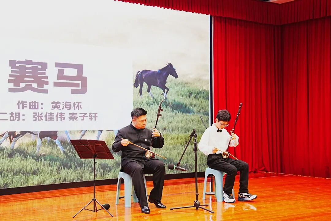 曲毕,他与张佳伟老师同台合奏二胡经典曲目《赛马》。合奏大有万马奔腾之势,竞相驰骋,既有你追我赶的灵动,又有默契相合的磅礴气势。