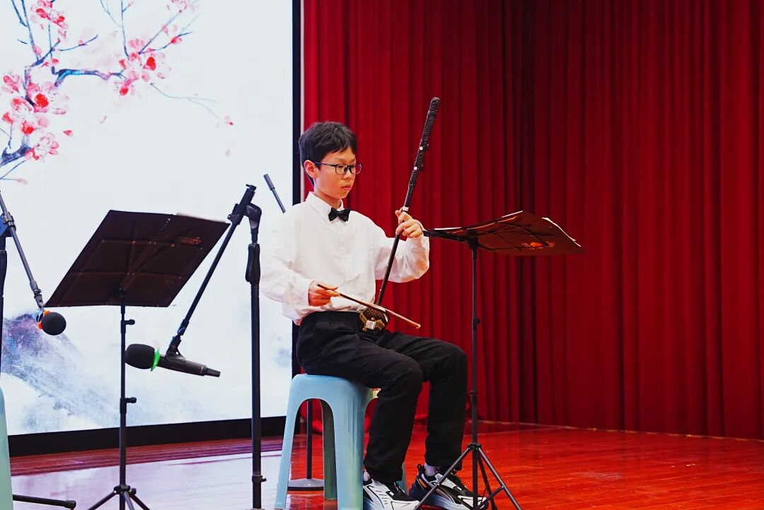 莘松中学七(6)班的秦子轩同学带来二胡独奏《红梅随想曲》。这首作品采用歌剧《江姐》的主题曲《红梅赞》及部分旋律为素材构思创作而成,旋律欢悦又富有歌唱性,生动展现革命女战士的积极乐观、英勇无畏。