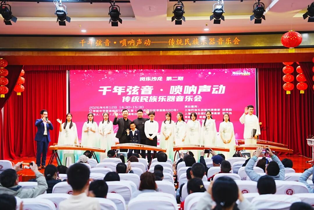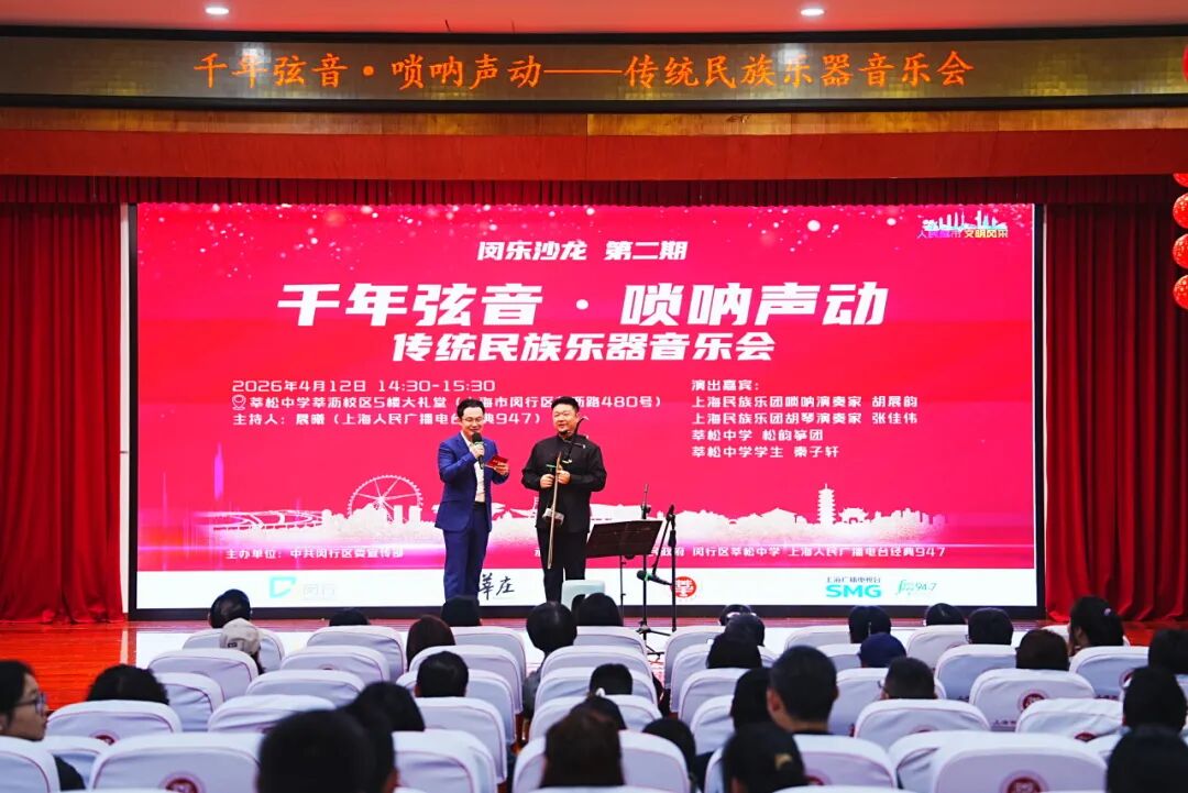 2026年4月12日下午,由中共闵行区委宣传部主办,上海人民广播电台经典947与闵行区各街镇共同承办的“闵乐沙龙”系列活动走进莘庄镇的莘松中学莘沥校区,上演“千年弦音·唢呐声动——传统民族乐器音乐会”,带领观众走进传统民族乐器的世界,感受它们在当下焕发的全新的魅力。