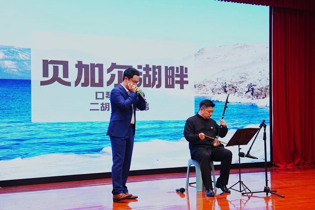 主持人晨曦也亮出口琴,轻轻吹出《贝加尔湖畔》的前奏。张佳伟的二胡也随之应和,两种音色一明一润,悠扬旋律与东方韵味交织,琴声如流水般交织缠绕,轻柔舒缓,将观众带入那片静谧的贝加尔湖畔。
