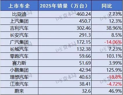 比亚迪的销量最高,为460.24万辆。2025年销量过百万辆的还有上汽集团、吉利汽车、长安汽车(000625.SZ)、广汽集团和长城汽车(601633.SH)。