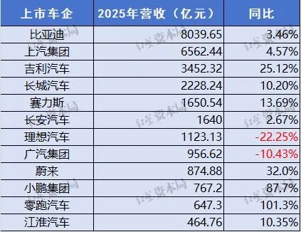 首先来看营收,2025年,这12家乘用车上市公司中,有10家的营收实现同比增长,广汽集团和理想汽车的营收分别同比下降10.43%和22.25%。
