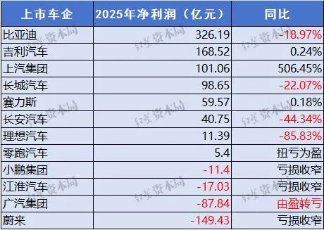比亚迪、吉利汽车与上汽集团的净利润超100亿元,分别为326.19亿元、168.52亿元和101.06亿元亿元,是2025年最赚钱的三家车企。