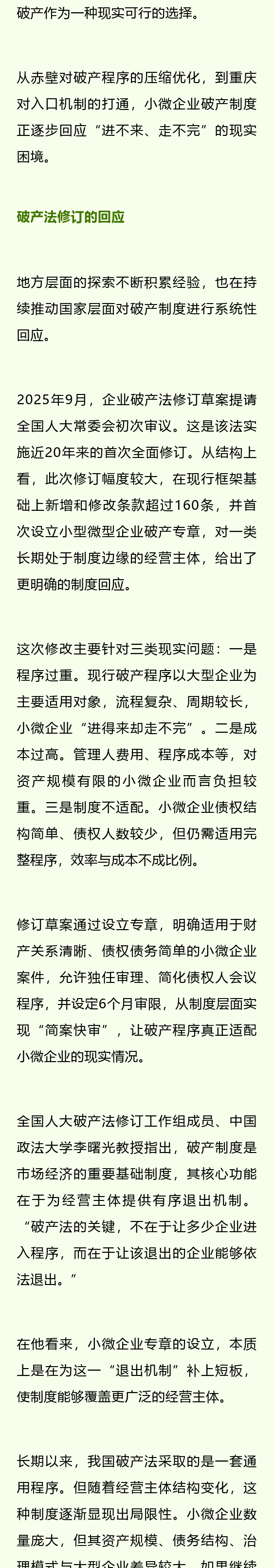 近日,《民主与法制》周刊2026年第12期以《“企业破产法大修”系列报道之三 | 小微企业主有望“体面退场”》为题,聚焦中小微企业退出困境与地方实践探索,认为从地方试点到立法回应,中小微企业破产制度正在逐步从“可探索”走向“可依循”。文中对赤壁法院探索建立“中小微企业快速重整与出清机制”予以充分肯定。全文如下: