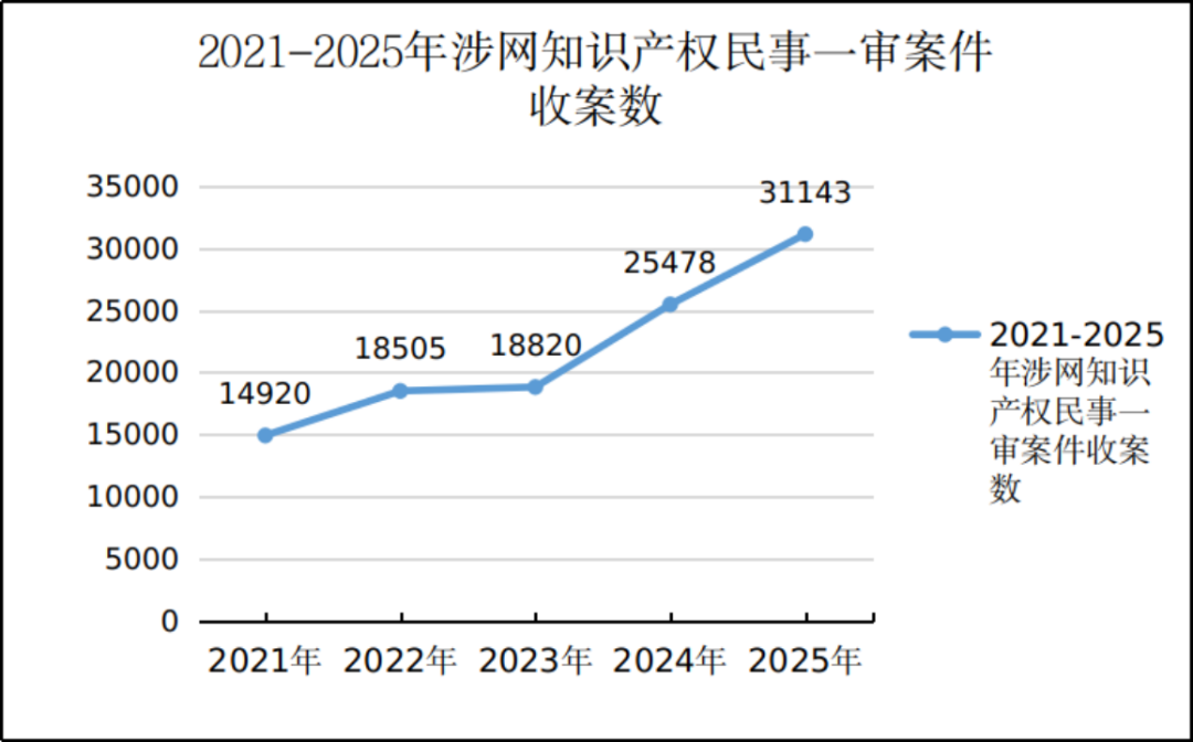 作为数字经济先行省,浙江涉网知识产权案件增幅明显。2025年共新收和审结涉网知识产权民事一审案件31141件和30586件,同比分别上升22.23%、40.66%。从案件类型看,著作权案件数量最多,共新收14834件,占比47.63%;涉网不正当竞争案件684件,增幅最高,达43.70%。从涉网案件占各类案件的比重来看,涉网专利权案件占比最高,占专利权案件总数的80.30%;其次是涉网著作权案件,占著作权案件总数的78.42%。