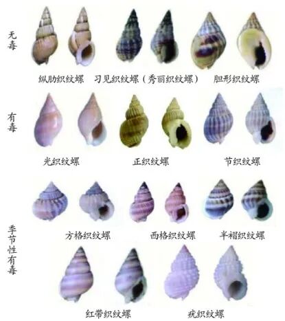 织纹螺并不是全科带毒的,按照毒性可分为:无毒织纹螺、季节性有毒织纹螺、有毒织纹螺。
