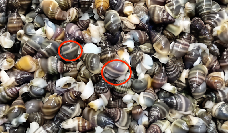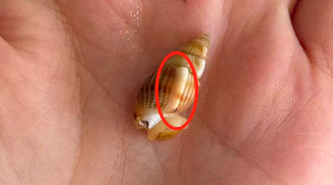 季节性有毒的半褶织纹螺,横向螺带为白色,如图中红色圆圈内所示|抖音
