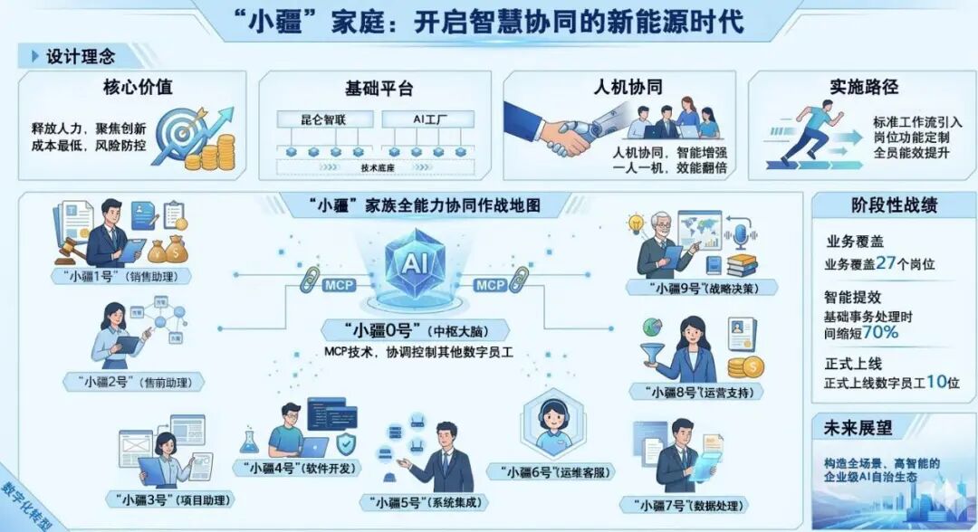 3月17日,随着“小疆7号”正式上线,昆仑数智新疆大区由10位数字员工组成的“小疆家族”全面投入运营。该家族依托昆仑数智AI技术底座,深度融入大区业务全流程,助力构建“人机协同”的新型工作生态。