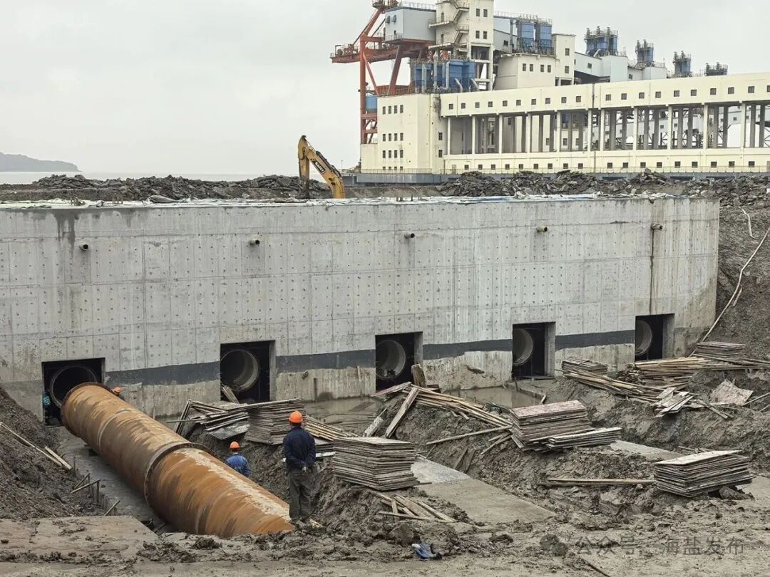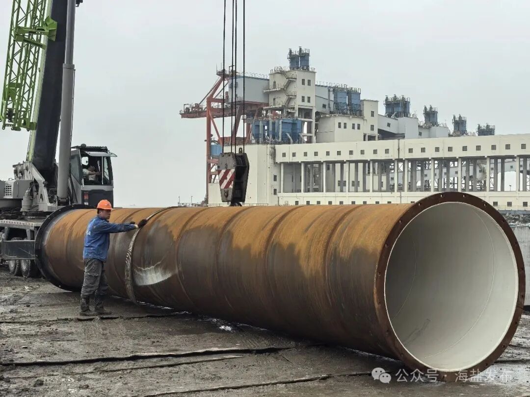 在入海口作业区内,记者看到,大型机械正精准吊装一根根直径达1.6米的出水管道,平稳安放至出水口预定点位。管道就位后,施工人员将依次完成表面打磨除锈、防腐砂浆涂抹、混凝土外包加固等全流程工序,全方位保障管道密闭性能与使用寿命。