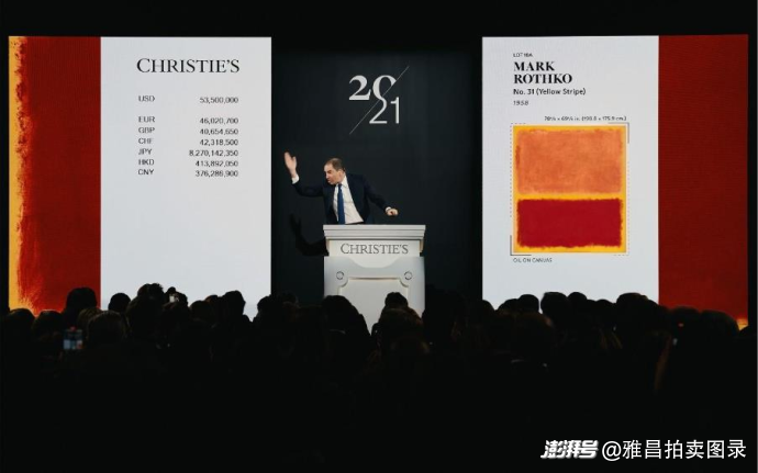 抽象表现主义大师马克·罗斯科典范之作《第31号(黄条)》,是艺术家投身传奇的西格拉姆大厦四季餐厅壁画项目创造力处于巅峰状态时期的作品。这一时期标志着艺术家创作生涯的关键性转变,开始了对饱和色调的探索以及对空灵精神的追求。在这幅作品中,罗斯科使画面与观众达到了一种强烈的精神共鸣。正如艺术家本人所说:“当你背对着这幅画时,你会感受到那种存在感,就像感受到阳光洒在你的背上一样。”这件拍品在佳士得纽约魏斯伉俪珍藏拍卖录得6,216万美元(约合4.36亿元人民币)成交的佳绩。
