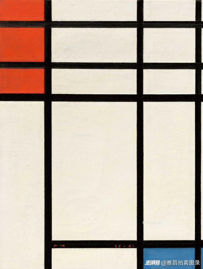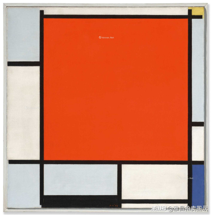 佳士得纽约李奥纳德及路易丝・里吉奥夫妇的私人珍藏拍卖中,皮特・蒙德里安新造型主义经典代表作《构成:大红色平面、蓝灰色、黄色、黑色和蓝色》以4,756万美元(约合 3.33 亿元人民币)高价成交。本件拍品曾先后借展于华盛顿特区国家美术馆与纽约现代艺术博物馆,其艺术价值与学术地位备受业界认可。作为蒙德里安艺术理念的巅峰诠释,作品以精准利落的黑色网格分割画布,大面积红色块占据视觉中心,蓝灰、黄、黑、蓝等色块错落排布,在纯粹的几何语言与克制的色彩运用中,构建出富有韵律感的动态平衡,完美呈现了新造型主义 “艺术即平衡” 的核心主张。