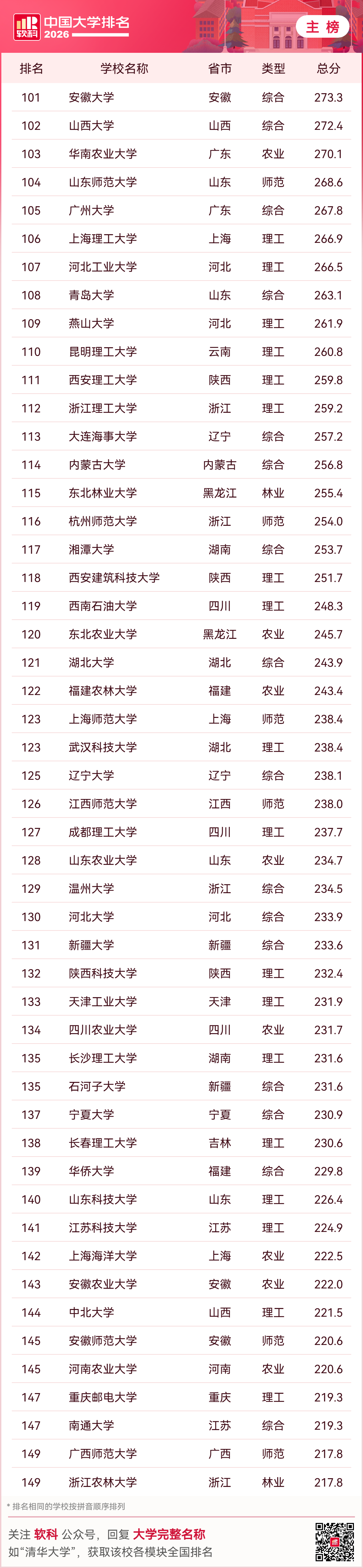 (2026年4月15日)高等教育专业评价机构软科15日正式发布“2026软科中国大学排名”。清华大学、北京大学、浙江大学雄踞主榜(即综合性大学排名)前三位。北京协和医学院蝉联医药类大学排名榜首,北京中医药大学摘得中医药大学排名桂冠,上海财经大学位列财经类大学排名之首,北京外国语大学占据语言类大学排名第一,中国政法大学问鼎政法类大学排名冠军,中央民族大学高居民族类大学排名首位,上海体育大学持续领跑体育类大学排名,香港中文大学(深圳)拔得中国合作办学大学排名头筹。