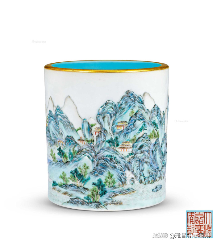 清嘉庆 浮雕洋彩描金庐山图笔筒