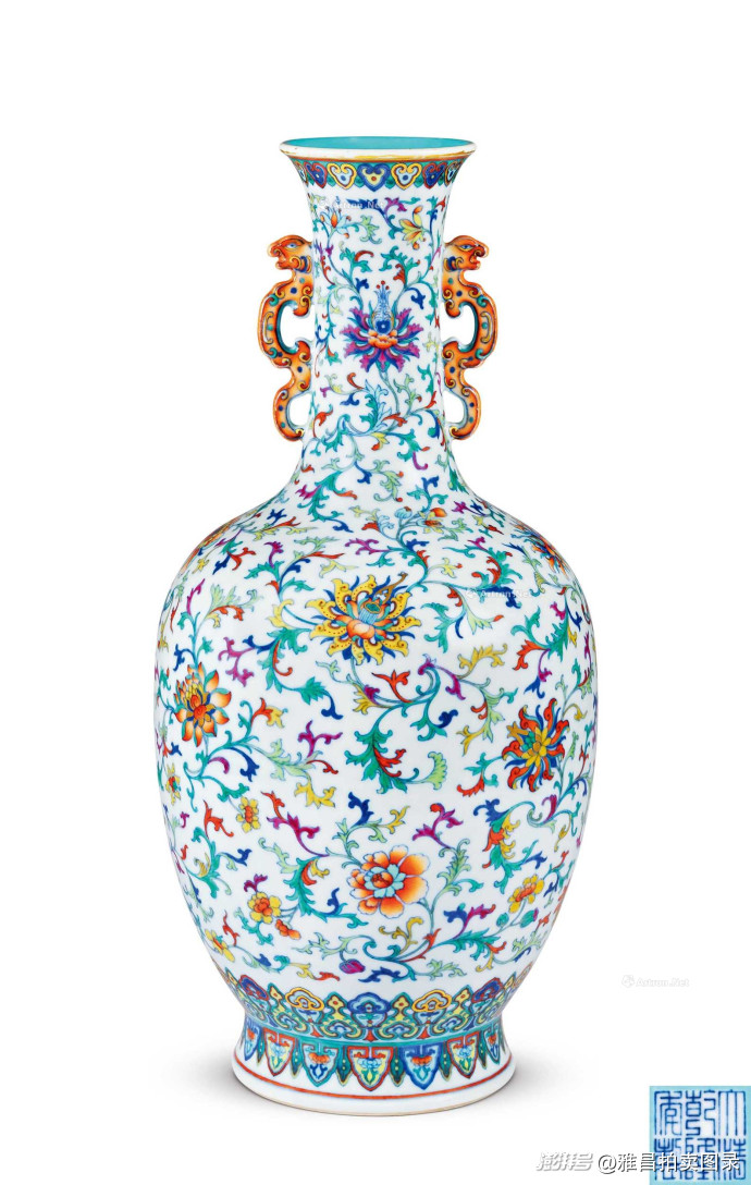 清乾隆 斗彩描金缠枝洋花纹双螭龙耳撇口瓶