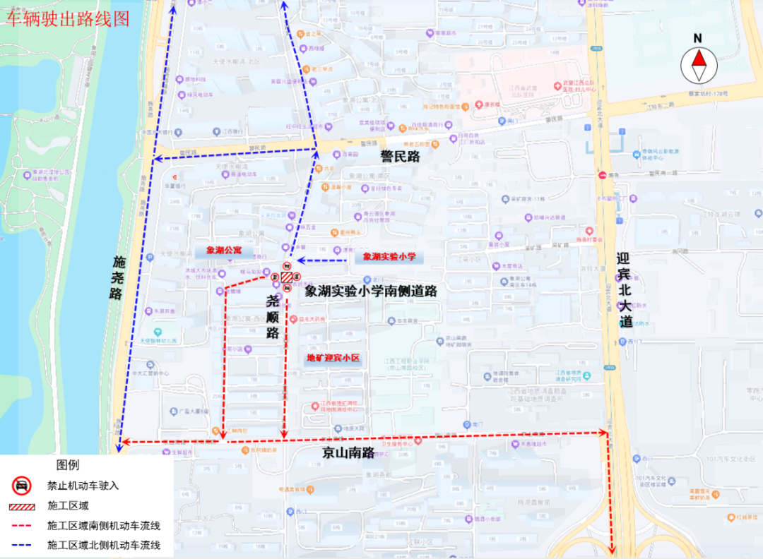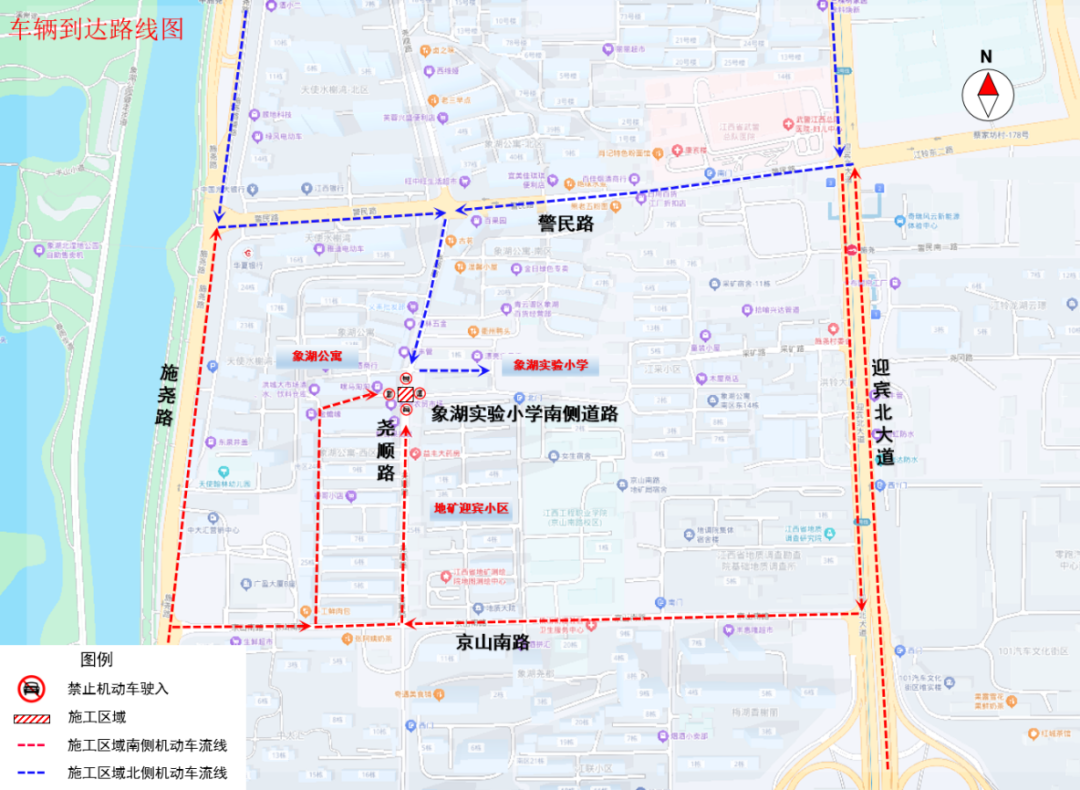 三、管制措施:尧顺路与象湖实验小学南侧道路交叉口禁止机动车通行,允许非机动车通行、行人通行。