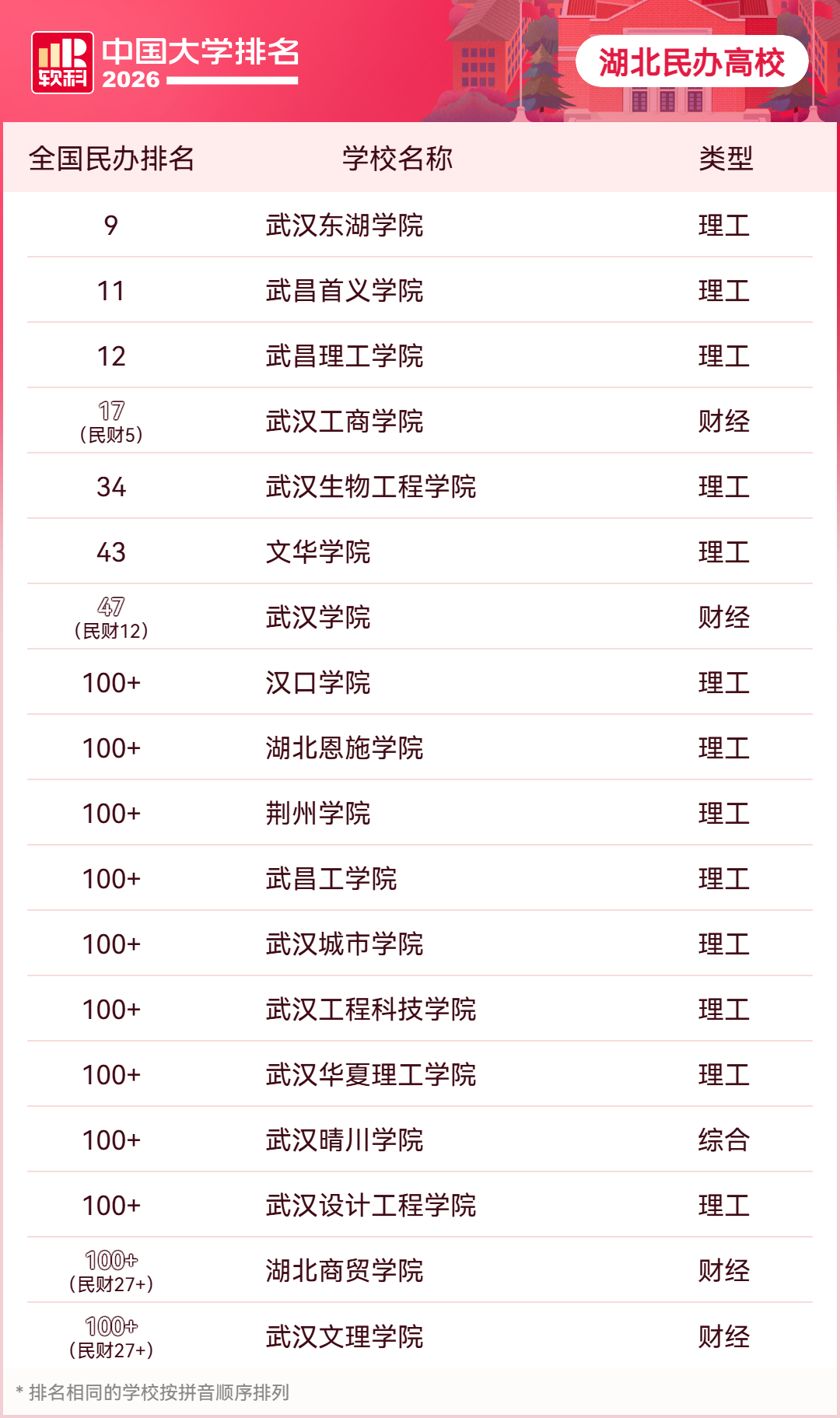 民办高校方面,湖北5所高校进入民办主榜前100名:武汉东湖学院(第9名)、武昌首义学院(第11名)、武昌理工学院(第12名)、武汉生物工程学院(第34名)、文华学院(第43名)。在民办财经类排名中,武汉工商学院位列第5名,武汉学院位列第12名。